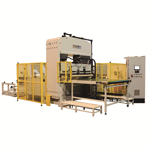 機器工作視頻:https://haokan.baidu.com/v?vid=14270463171937633783 一、用途 全自動汽車隔音保溫棉裁斷機適用于卷、片狀材料熱壓成型、沖切生產(chǎn),對一系列的汽車隔音棉等非金屬材料進行連續(xù)沖裁作業(yè) 二、工作原理 機器自動送料、自動沖切、自動封邊,自動出料。將刀模固定在沖切主機的上壓板上,將物料穿引至輸送進料部分的移動夾下面,按下夾緊按鈕,移動氣夾將物料自動夾緊在輸送帶上,掀下電控箱上的啟動按鈕,移動氣夾夾住物料和輸送帶會按設(shè)定的長度向主機送料,當(dāng)達到設(shè)定長度時,固定氣夾夾緊物料,(移動氣夾返回至原點,等待下次送料)主機下行沖壓后回升,輸送進料部分再次送料,同步出料輸送帶與輸送進料部分同步運行,將沖切好的產(chǎn)品輸送到檢料區(qū),工人檢拾成品,如此循環(huán)。 三、機器主要參數(shù) ?最大沖裁力: 1500KN;可定制 ?加熱壓板面積: 1600x1000mm;可定制 ?適用最大成品尺寸: 1500x900mm;可定制 ?張距: 50-200mm; ?沖程調(diào)節(jié)范圍: 5-150㎜(可調(diào)); ?上下工作臺平行度: ≤±0.10㎜; ?適用材料幅寬: ≤1600㎜; 四、主要元器件供應(yīng)商